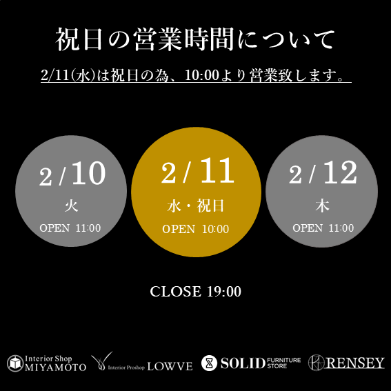 2月11日(水)は建国記念の日で祝日となりますため、 通常水曜日は定休日とさせていただいておりますが この日は休まず営業いたします。