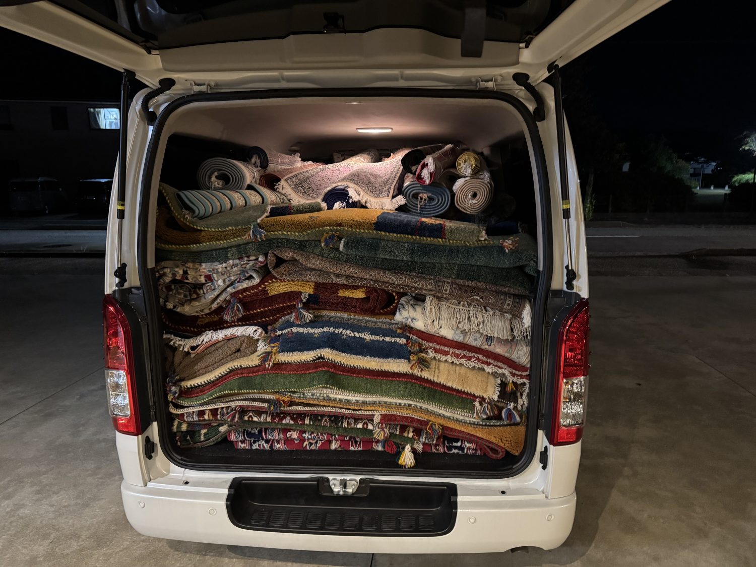 いつも通りこの車にギュウギュウ詰めになって届けられた絨毯たち