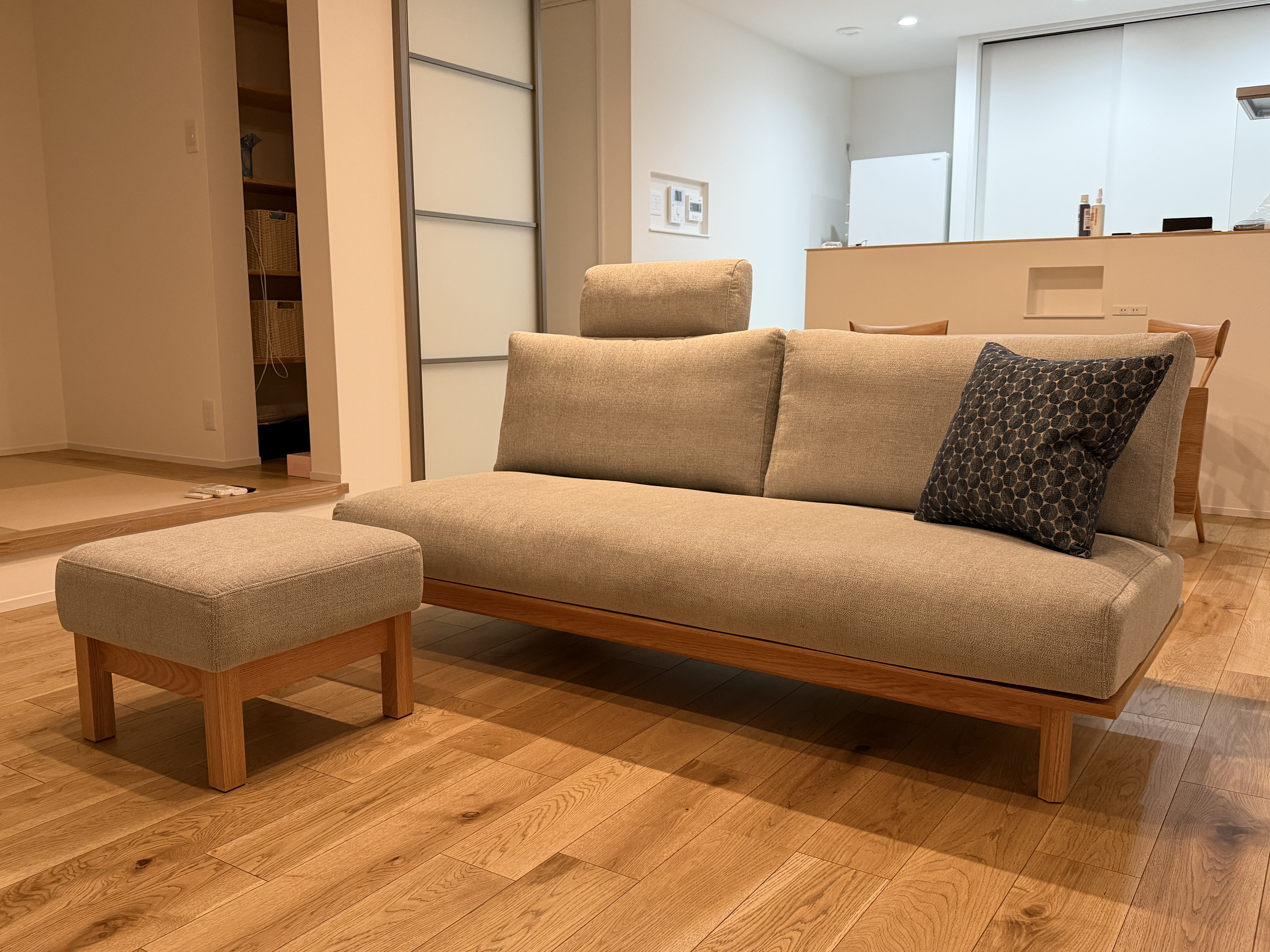 オーク無垢材オイル仕上げにメインのグレー生地とアクセントのドット(紺)