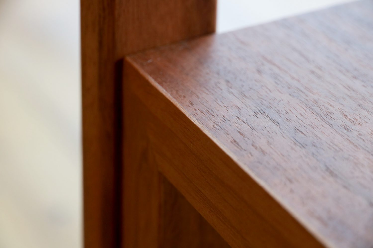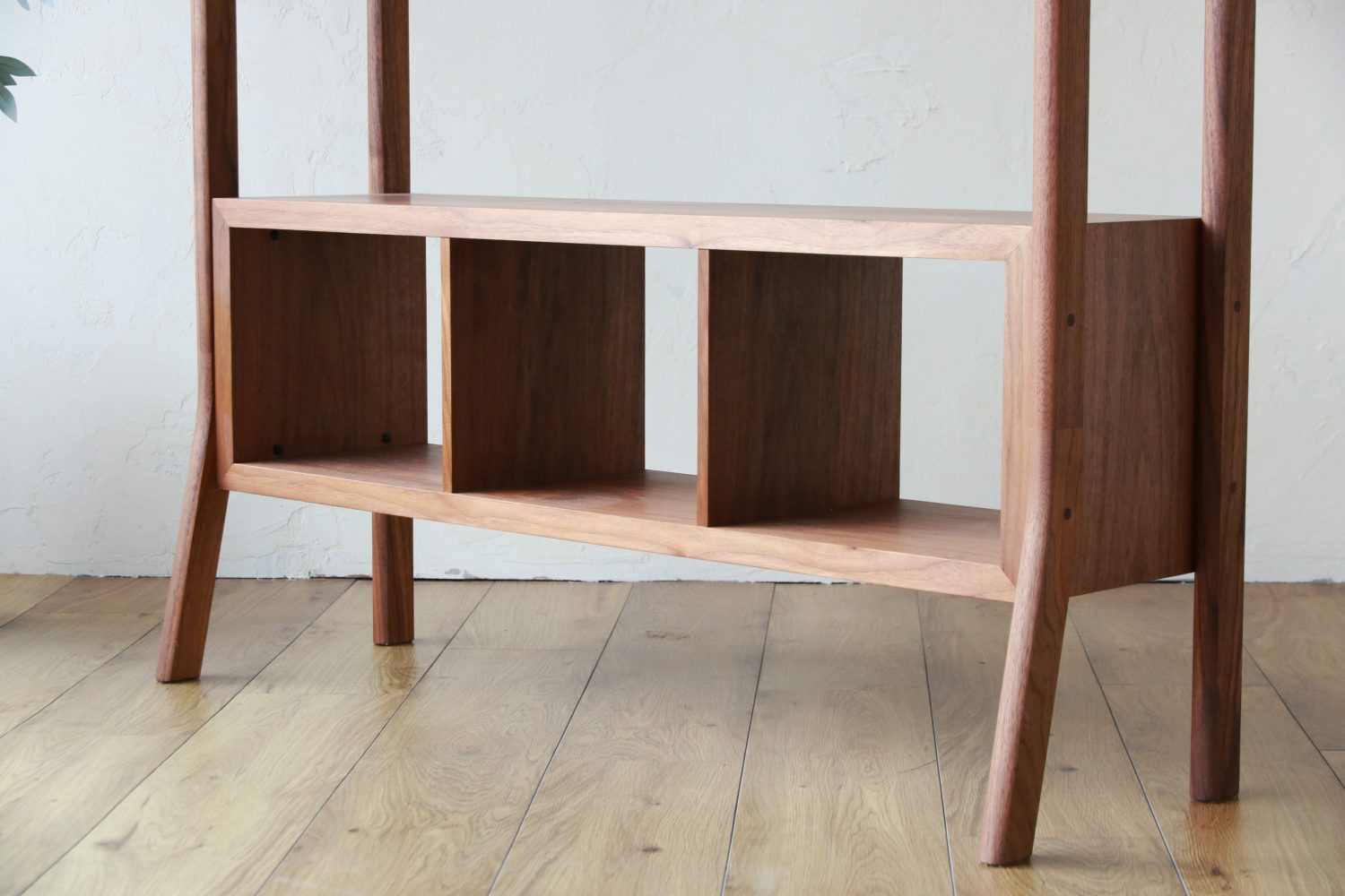 オープンラック部分は突板材ですが、劣化しやすい木口部分(正面部分)は3mmほどの無垢材を貼った造りになっており