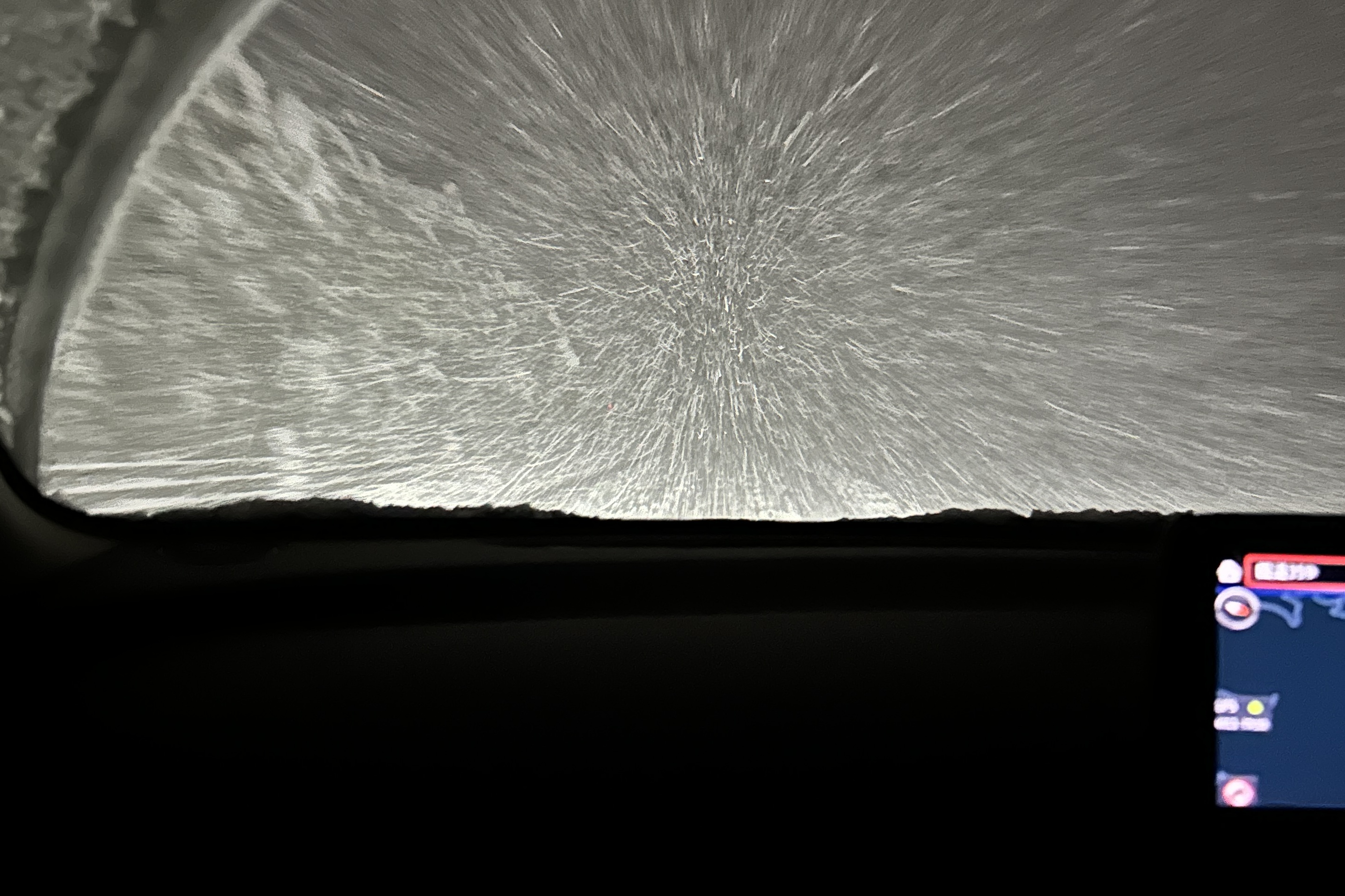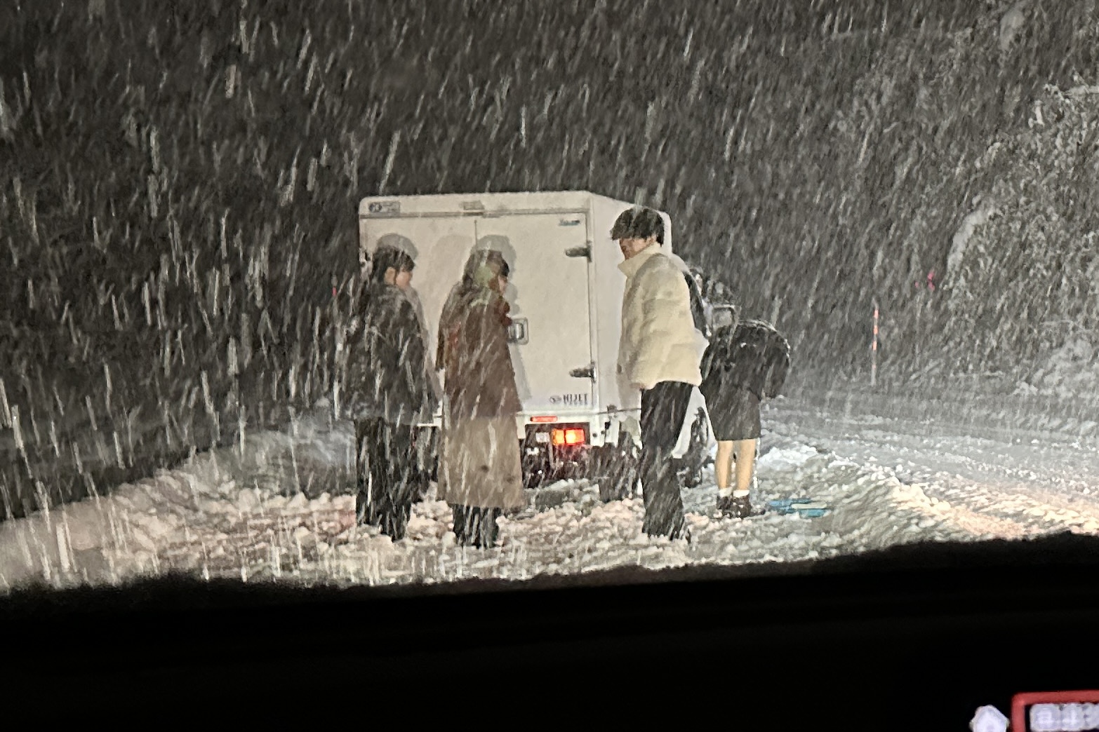 全く前が見えないホワイトアウト状態が続き、ナビに表示される道のくねくね具合を頼りに少しハンドル左。右。とうねる山道をなんとか越えました。