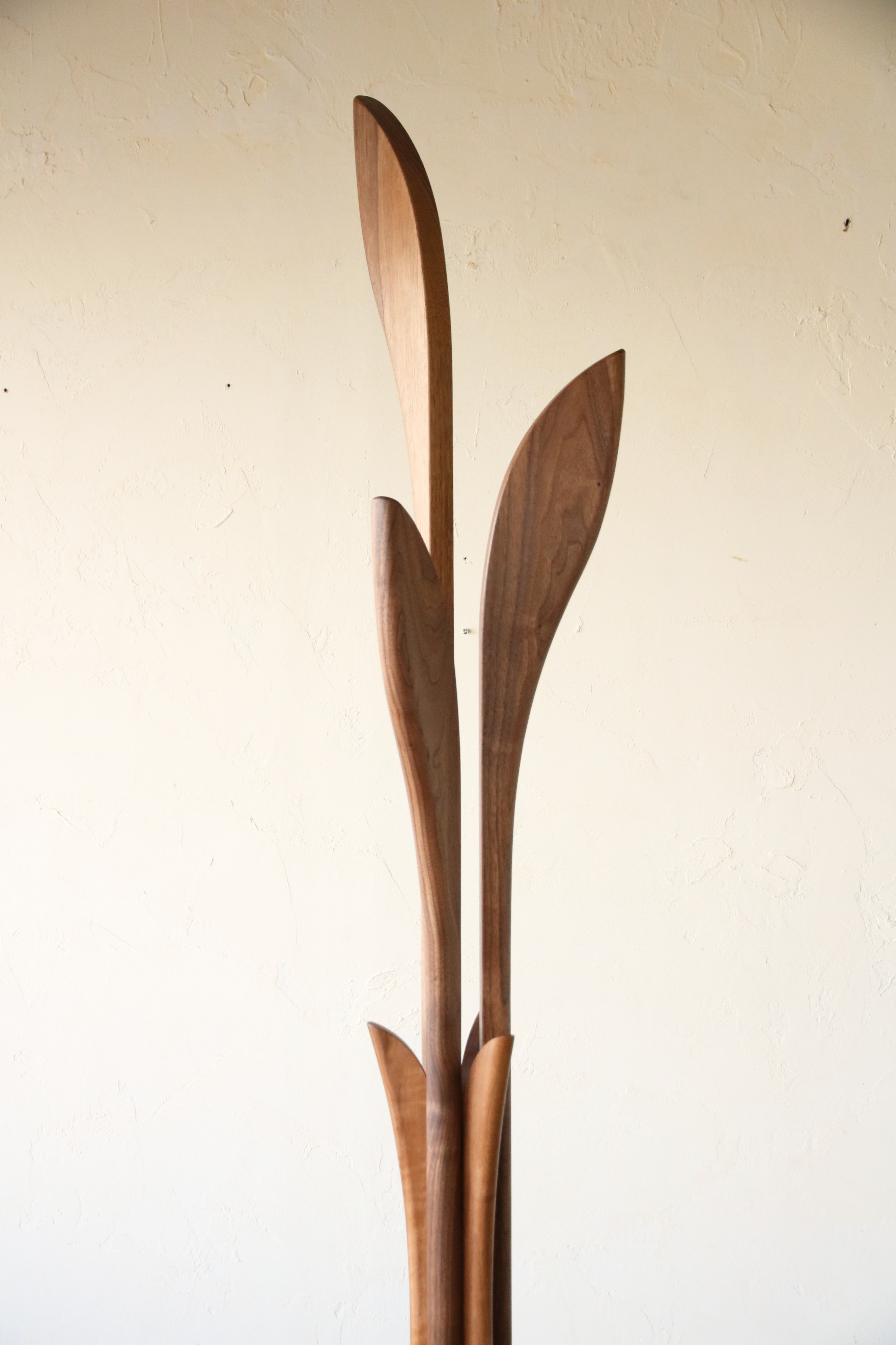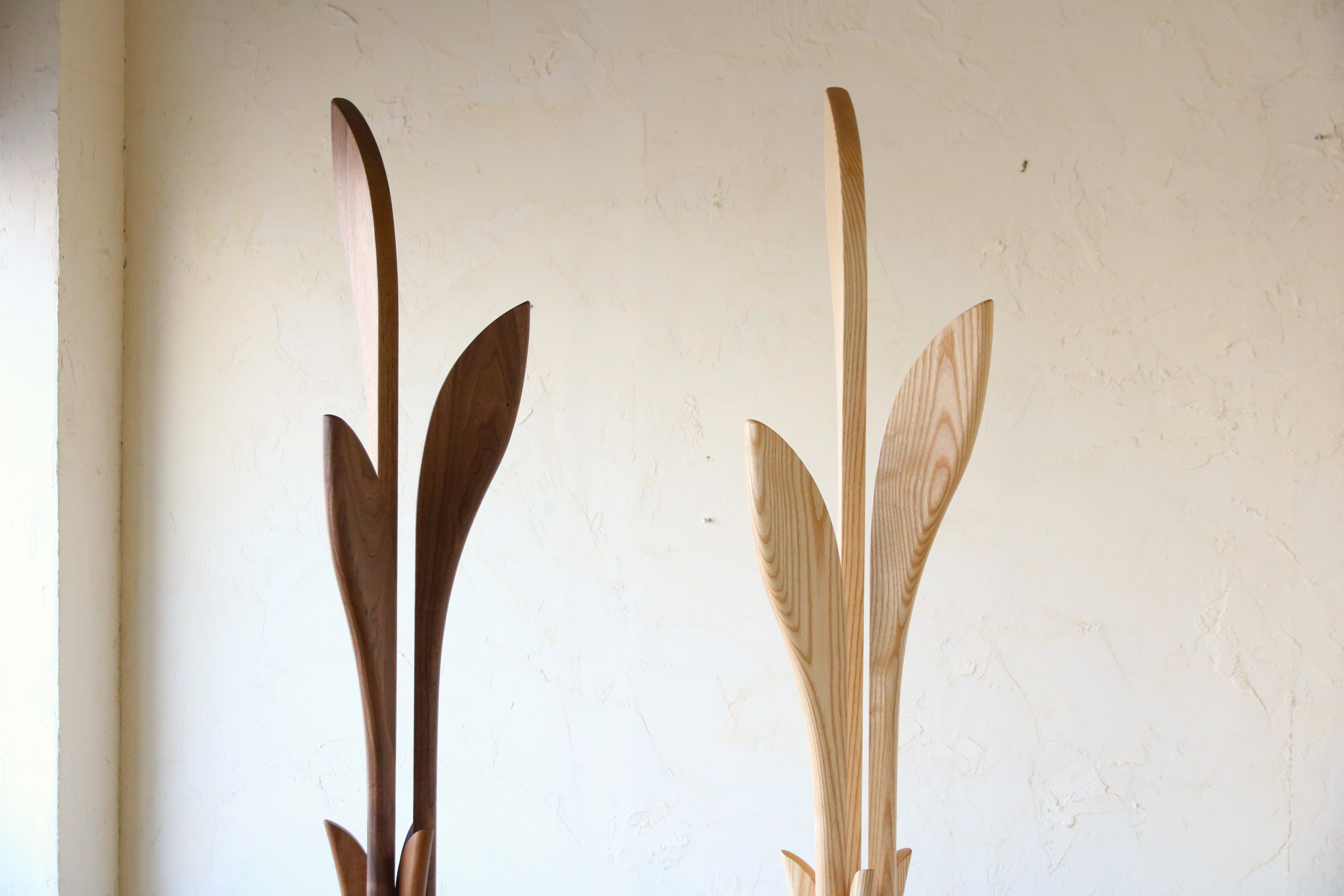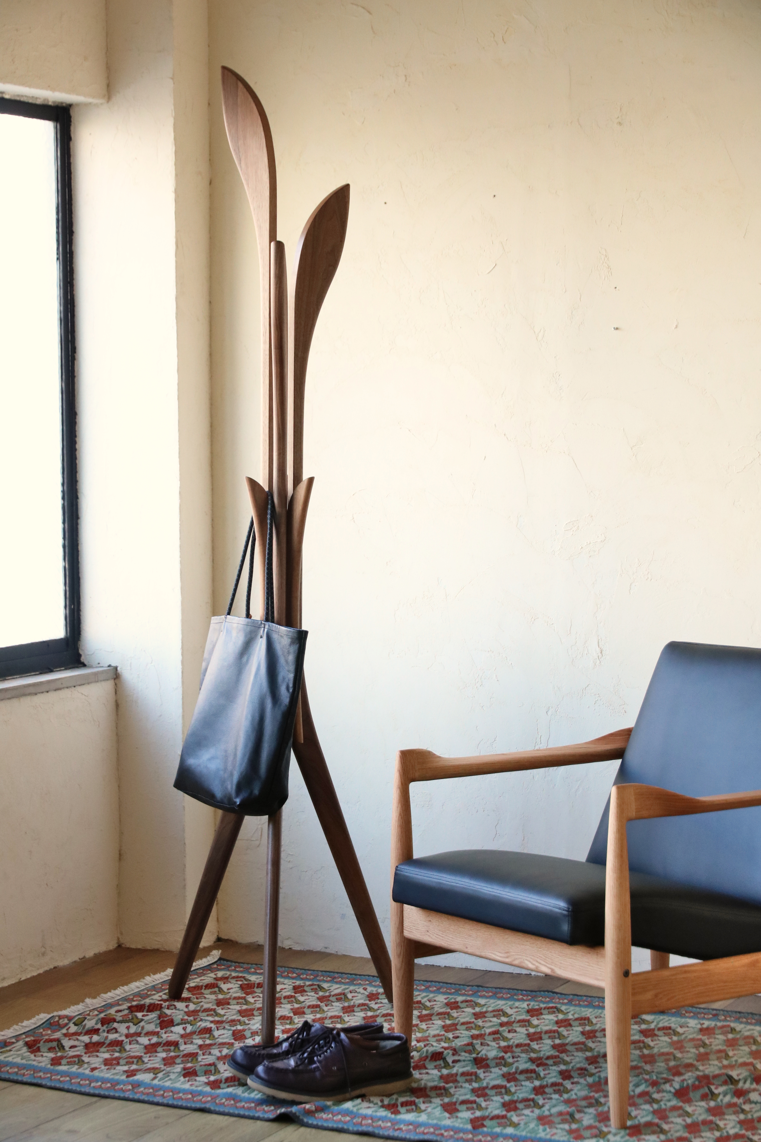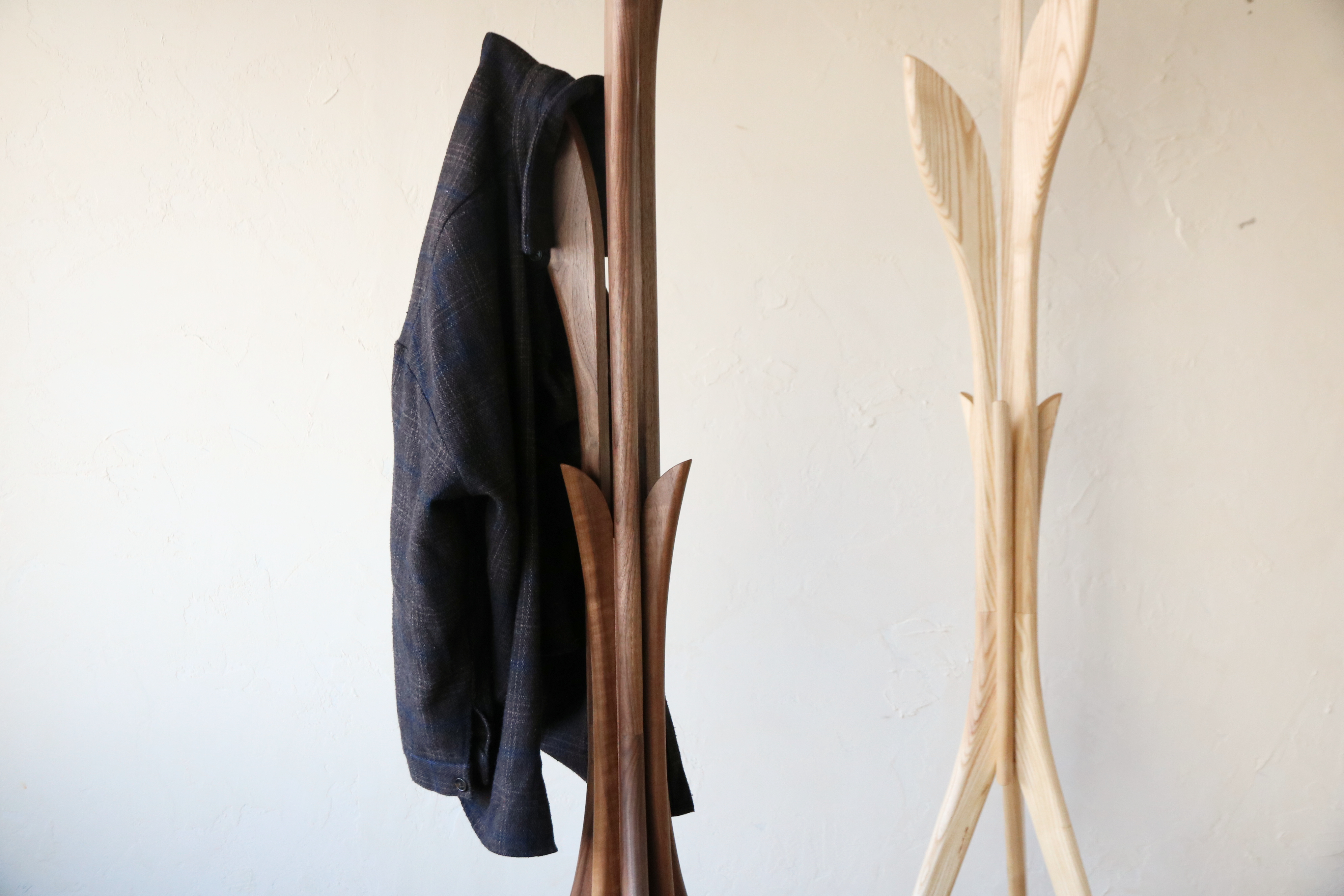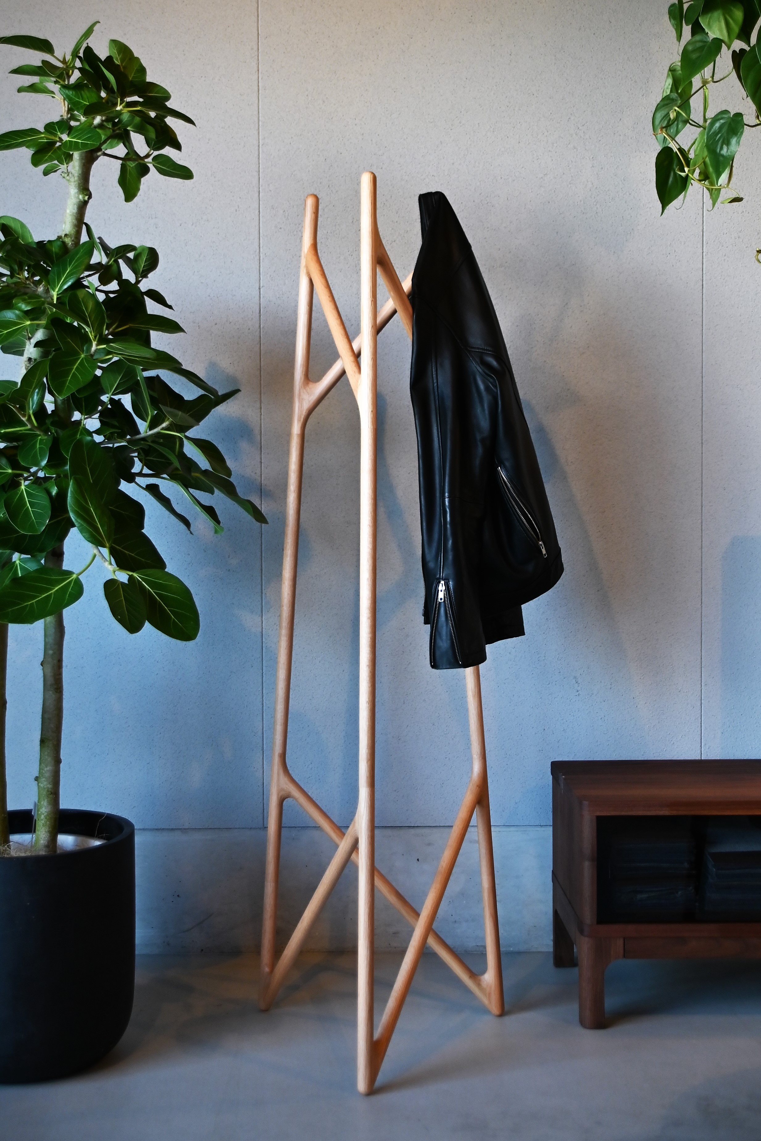 すっと伸びた木のラインがきれいな、ハンガースタンド。