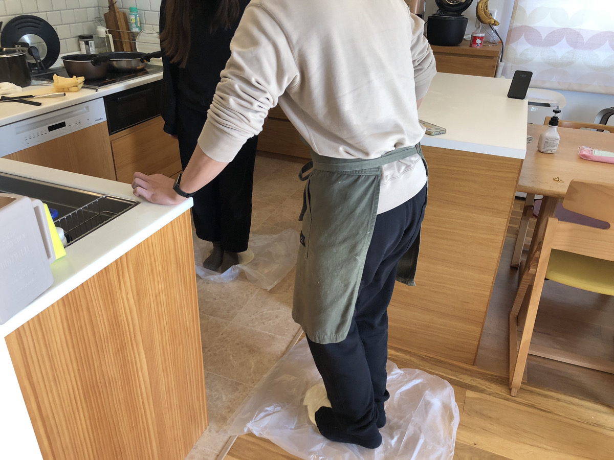 足で踏んでさらに生地を伸ばします