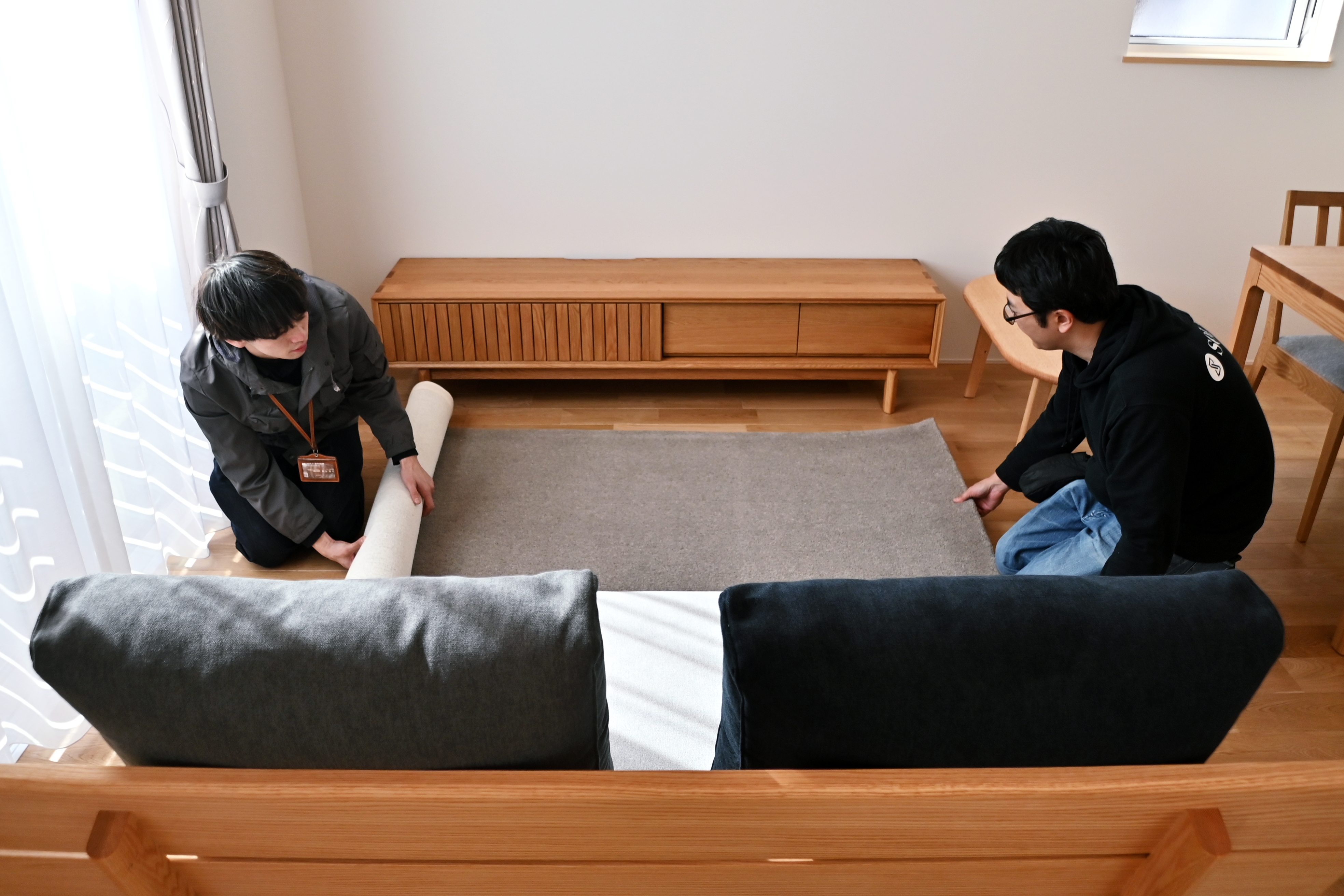 ↑ラグを敷きながら最後の仕上げに取り掛かる