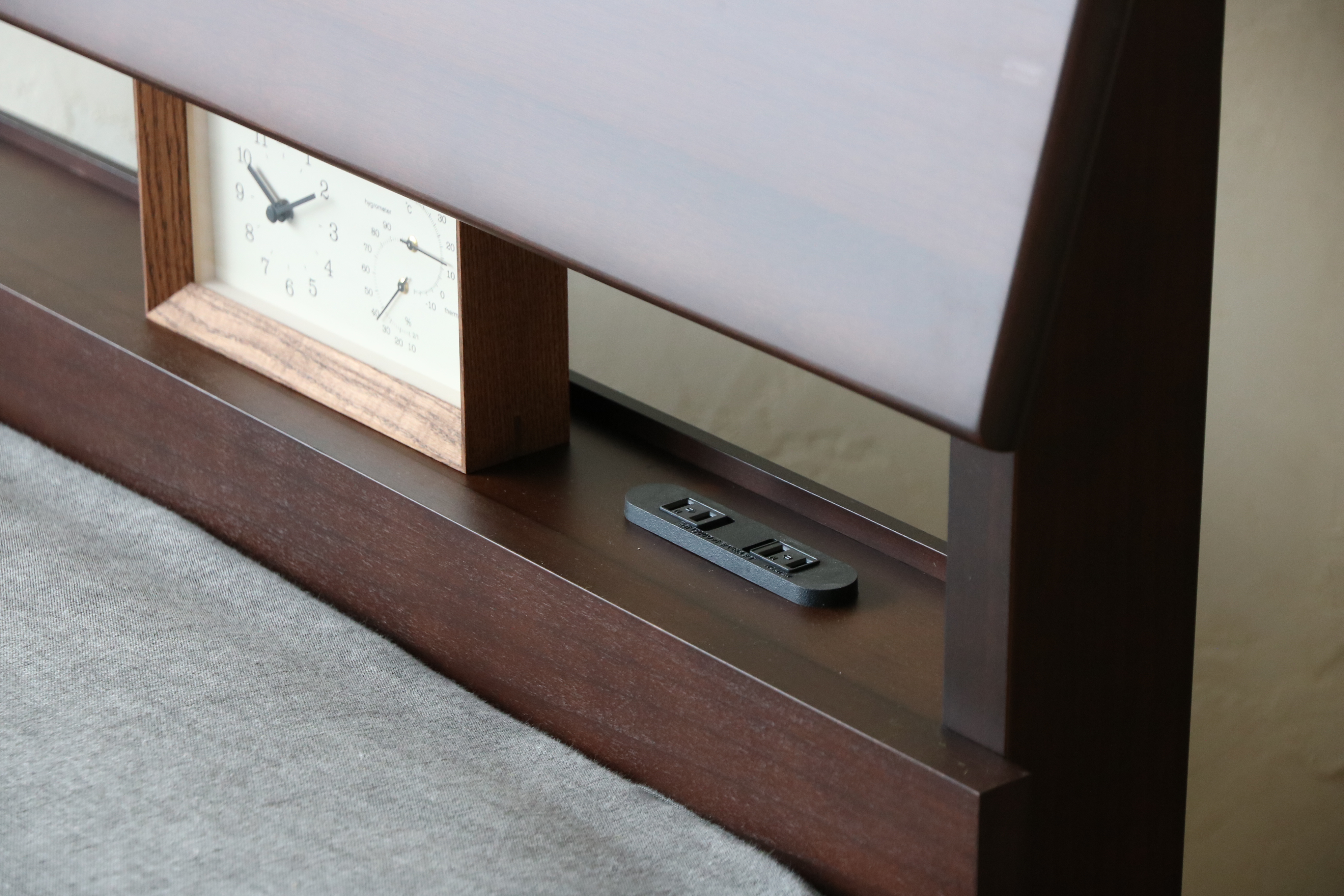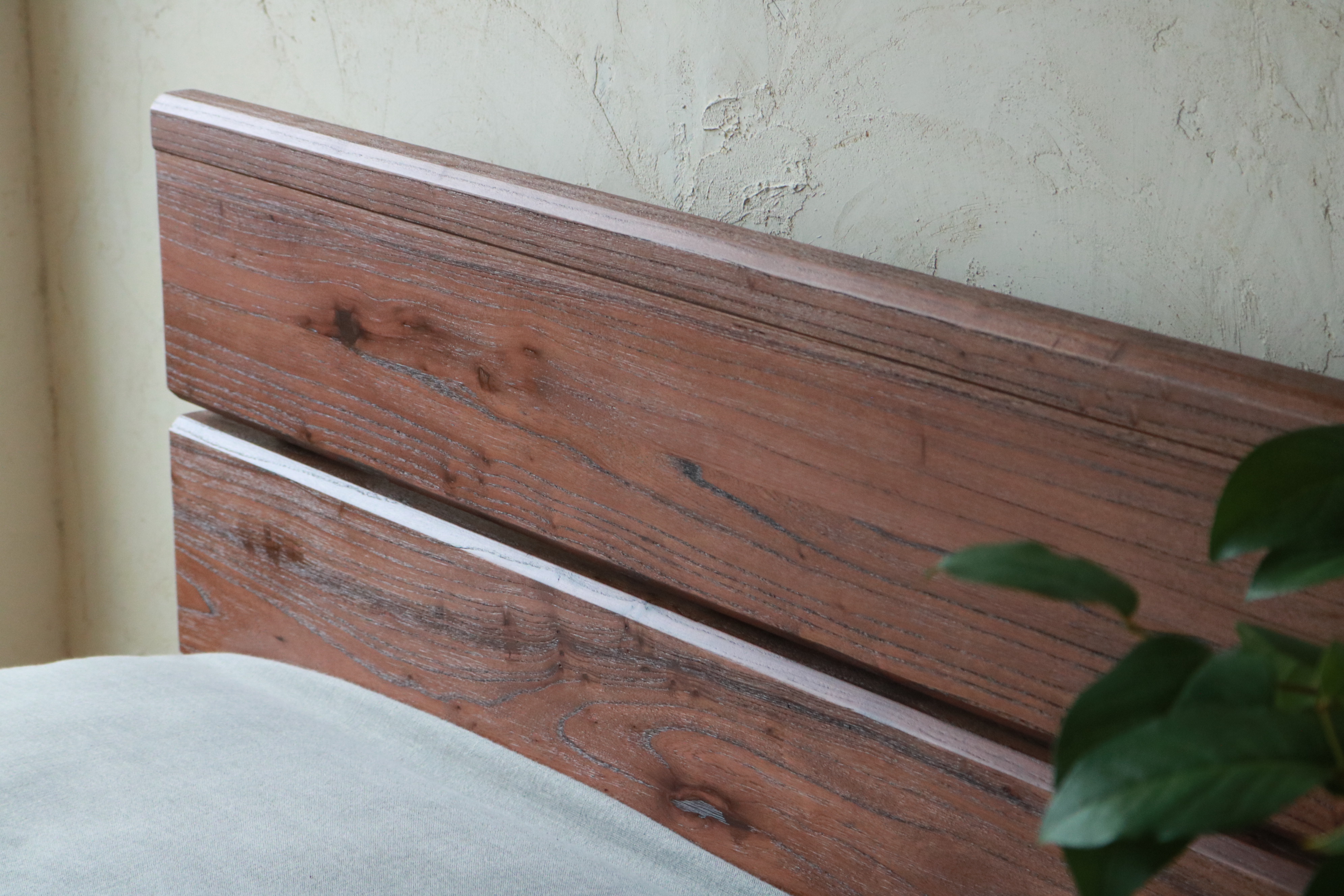 無垢材ならではの節が入った躍動感のある木目を楽しめるヘッドボード。